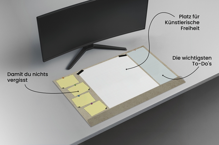 - • Große Planungsfläche für Wochenübersicht, Projekte, Skizzen und Ideen